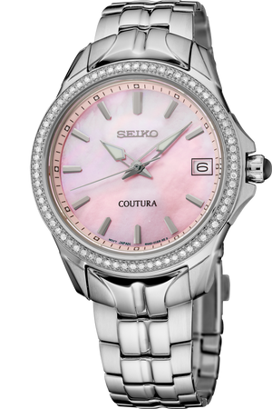 Part of the prestigious Coutura Collection, this timepiece merges contemporary elegance with refined functionality. The watch showcases a striking diamond-set bezel—72 stones in total—paired with a luminous pink mother-of-pearl dial featuring silver applied indices that create captivating depth and dimension. Constructed from stainless steel with a proportioned case and bracelet designed for a sleek silhouette, it transitions seamlessly from professional to casual settings. Enhanced with a scratch-resistant sapphire crystal, LumiBrite luminous hands and markers, date window, and a tri-fold push-button clasp, this sophisticated timepiece delivers both style and substance. Water resistant to 100 meters. Case 34mm