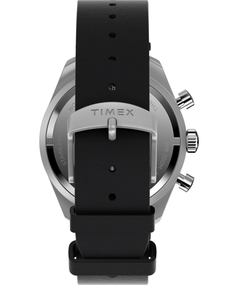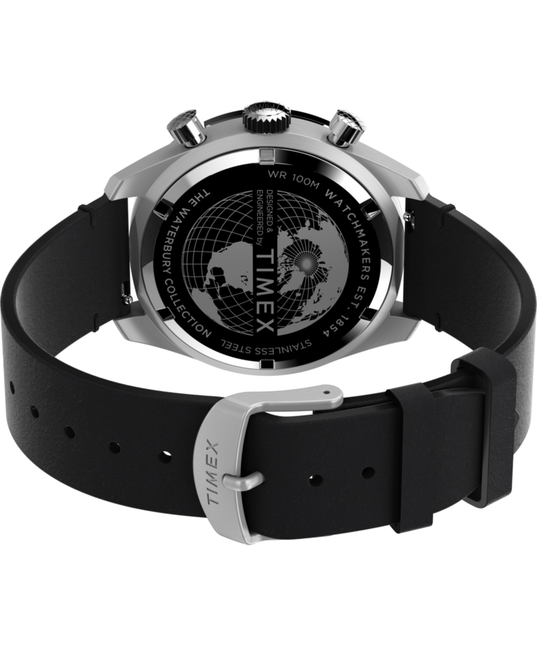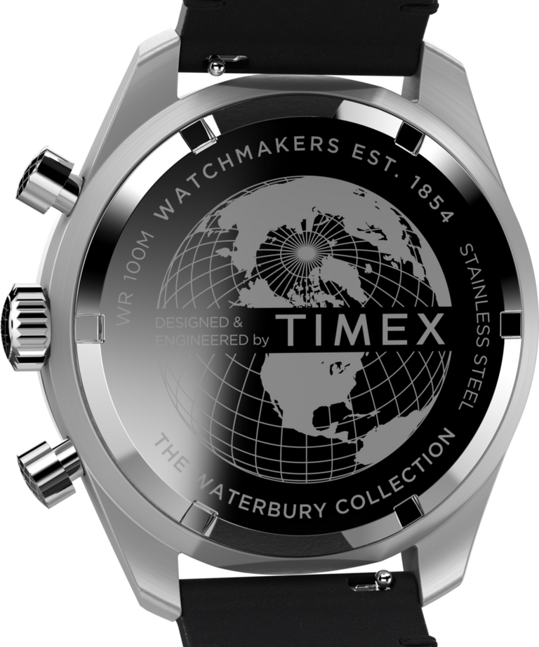 The TW2V42500VQ introduces a new quartz addition to the Waterbury family, blending signature design elements from the classic Waterbury case. Exemplifying meticulous craftsmanship, it features refined finishes and thoughtful watchmaking details. Paying homage to the original line, the dial and second hand display The Waterbury Watch Company logo, with the second hand showcasing the stylized W. Enhancing the traditional case, this model includes a chronograph with a tachymeter bezel. Completed with a sleek black dial, complementary sub-dials, and a black leather strap, it balances precise functionality with timeless style.