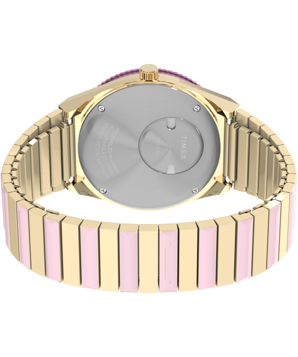 This refined version of our Women’s Q Timex showcases a delicate pastel palette, blending soft pink hues across the dial, bezel, and brushed gold-tone stainless-steel Perfect Fit expansion band. It retains essential Q features such as a bidirectional rotating top ring, day and date display, prominent hour markers, and a domed acrylic crystal, combining style with practical functionality.