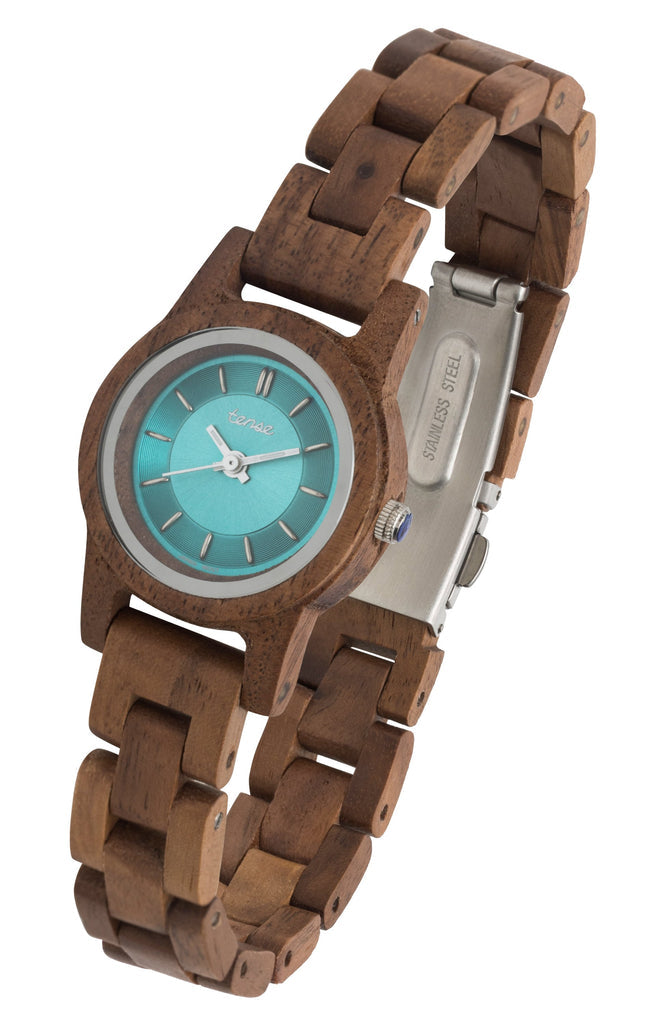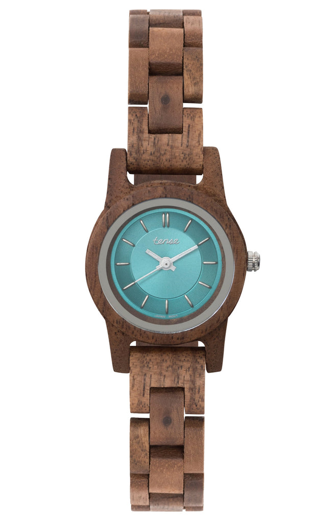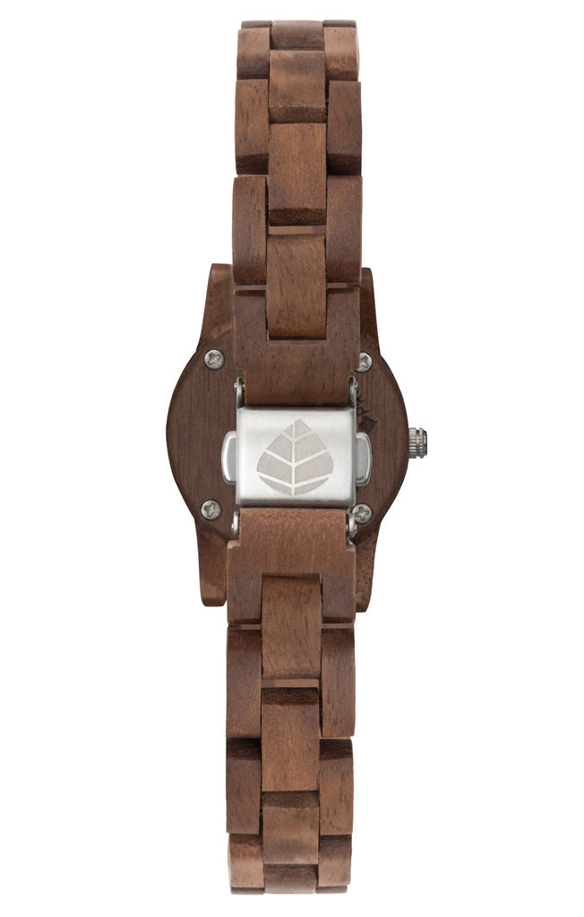 This women's timepiece displays hourly markers on a circular dial and showcases the timeless Hampton design in a smaller scale. The Mini Hampton II is constructed entirely from 100% recycled or reclaimed wood and is powered by a reliable Miyota Japanese movement. It offers an adjustable fit for comfort. Due to the natural characteristics of wood, each watch is uniquely individual and may vary slightly from the images shown. All Tense Watches are meticulously crafted in Canada. Dimensions: 26mm case height and width, 10mm case thickness, and 17mm band width.
